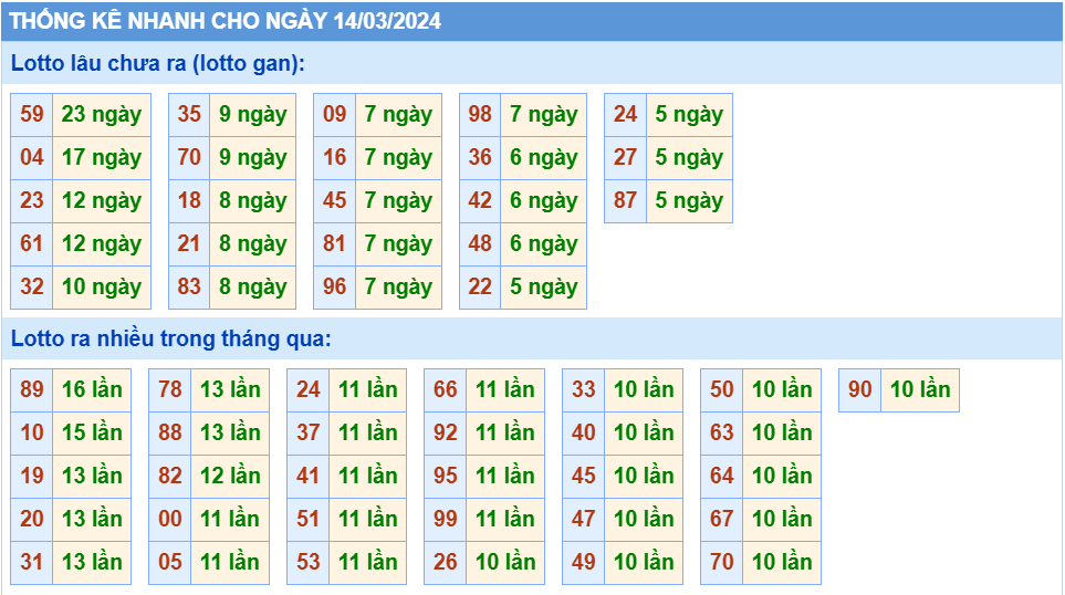 Thống kê tần suất lô gan MB ngày 14-3-2024