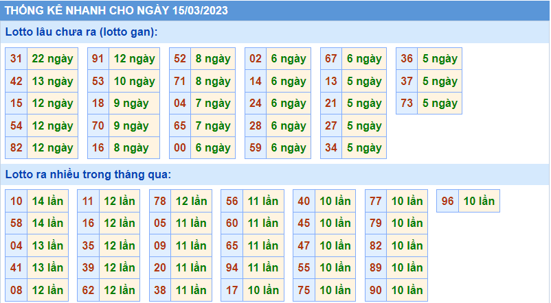 Thống kê tần suất lô gan MB ngày 15-3-2023