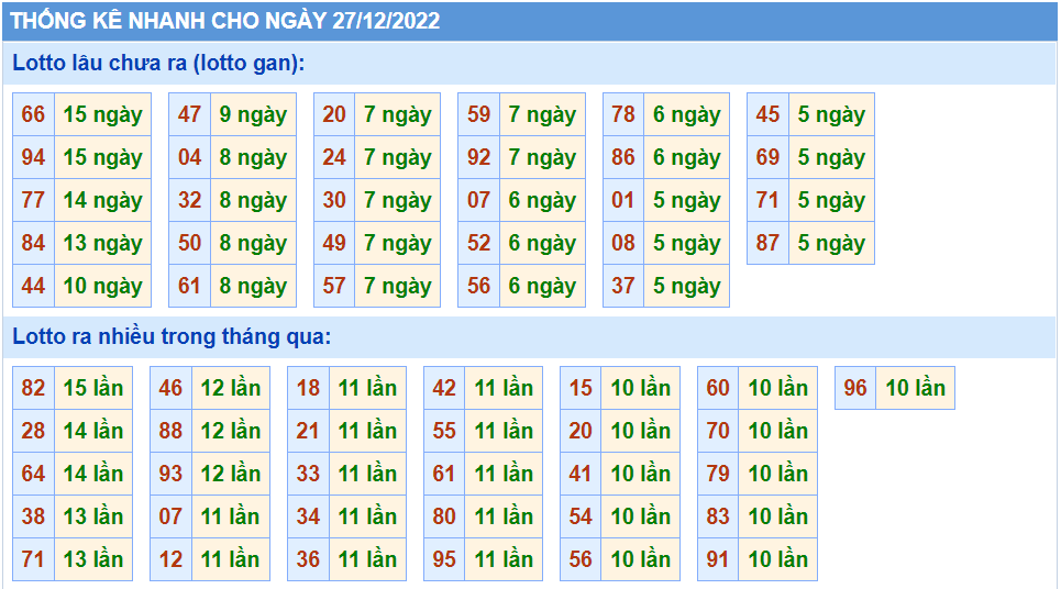 Thống kê tần suất lô gan MB ngày 27-12-2022